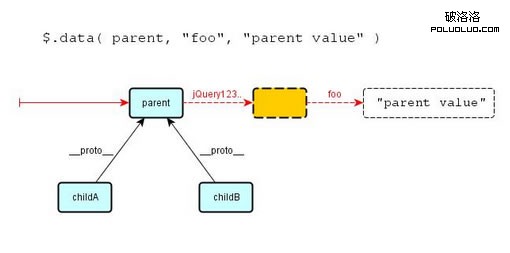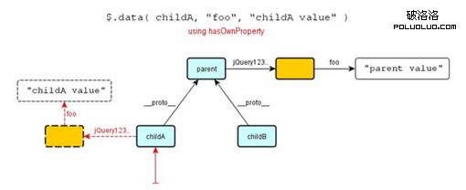 對象childA並不存在該數據,因此它沿著原型鏈向上查找,父對象剛好擁有該數據,其值立即被改寫。所以,從parent和childB這兩個對象獲取“foo”的值,得到的將是“childA value”,而不是“parent value”。