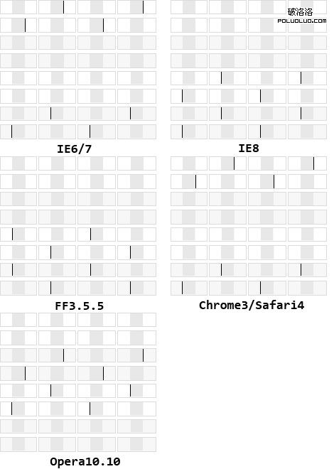 隨後Steven Wittens的《CSS Sub-pixel Background Misalignments》,測試了固定寬度的元素水平居中時父元素背景圖片居中的差異,更讓我們看到眼花(demo):