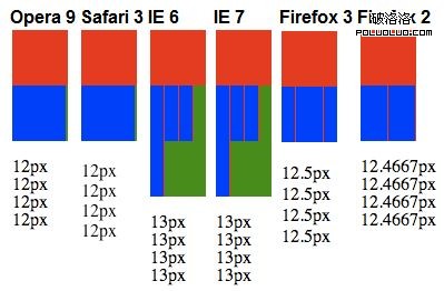 jQuery之父John Resig寫過一篇《Sub-Pixel Problems in CSS》,一個50px寬的div中有4個float的div,每個寬25%,然而各個浏覽器對50*25%的理解有些糾結(demo):
