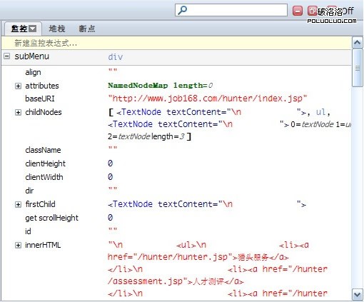 如過需要查看某個對象的值,可以點擊新建監控表達式,例如輸入對象的名稱:subMenu