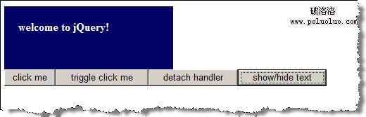 $('<input type="button" value="click me"/><input type="button" value="triggle click me"/><input type="button" value="detach handler"/><input type="button" value="show/hide text"/>').appendTo($('body'));