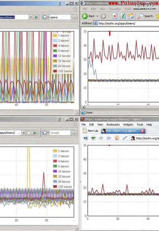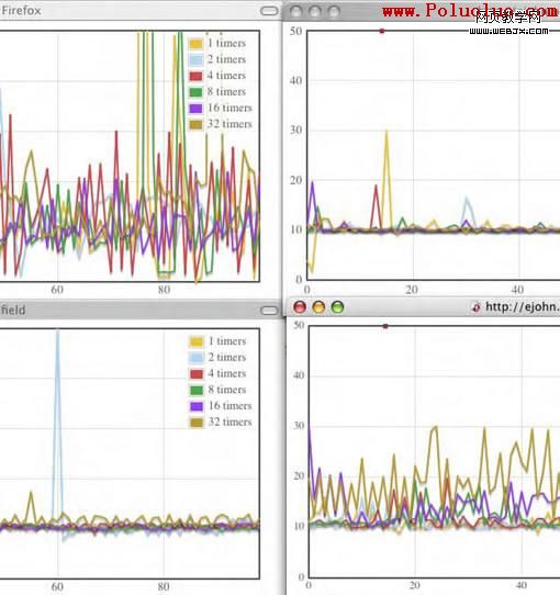 從這些表中我們可以得到其它信息。最重要的是加強了我們以前所了解到的:浏覽器不能保證你所指定的精確的時間間歇。像Firefox 2,Opera 9(OS)在提供可靠的執行率方面有一定的難度。很多與浏覽器如何處理Javascript的垃圾回收有關(Firefox 3在Javascript的執行上作了顯著的改善,其垃圾回收在這些結果中立竿見影)。