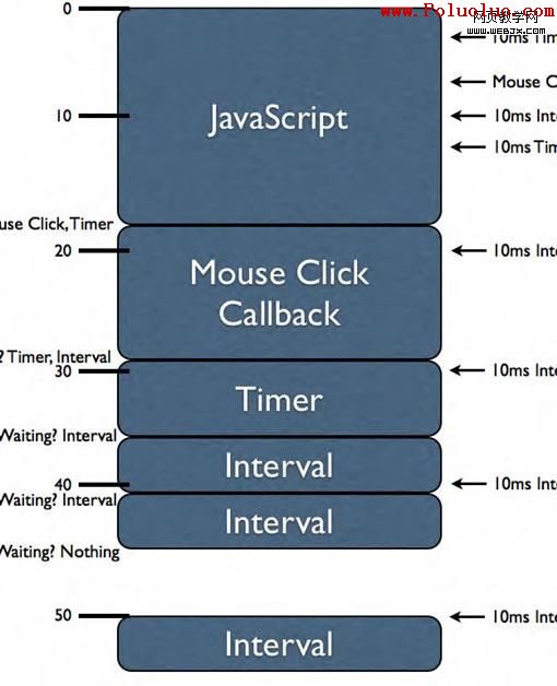 為了理解計時器內部是如何工作的,有一個很重要的概念需要加以探討:延遲是無法保證的。既然浏覽器中所有javascript 是在一個單線程中運行的,那麼異步事件(如鼠標點擊、計時器)在執行中也只有存在開放狀態時才運行,下面這張土很好的說明了這個問題: