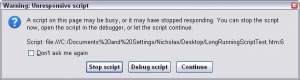 Firefox的對話框提示:“這個頁面的一段腳本目前運行忙,或者這段腳本已經停止響應。你可以停止執行這段腳本,並在調試器中打開這段腳本,或 者保持這段腳本繼續運行”。更清楚的描述了遇到的問題,並且沒有IE說的那麼恐怖。在這個對話框上可以執行三種操作:停止腳本執行、調試腳本或者讓腳本繼 續運行。和Internet Explorer一樣,當運行腳本繼續運行以後,對持續運行腳本時間的統計就會重置。調試腳本按鈕,只有在你安裝了Firebug,並在該頁面激活了調試 的時候才會出現。執行調試腳本操作後,可以顯示執行時間過長的代碼段的具體位置。