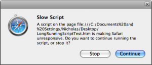 Safari同樣根據腳本引擎持續執行腳本的時間來判斷,當我對Webkit的源代碼進行反復研究後,發現默認的超時時間是5秒,一旦達到這個上限,就會給出下面的對話框提示: