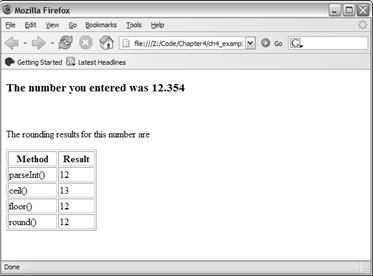 對於表格,首先創建了一個表頭,然後對於每一個取整方法,使用了獨立的一行來顯示。可以看到,在JavaScript代碼中,動態地創建Web頁面的HTML標記是很容易的。動態地創建HTML標記的原則與在Web頁面中使用HTML標記時是一樣的:HTML標記的語法必須是有效的,否則頁面上將顯示出一些錯誤的信息或者什麼都不顯示。對於表格的每一行,創建的方法都是相同的,只是使用了不同的取整方法。對於表格的第一行,使用了parseInt()函數,代碼如下所示: