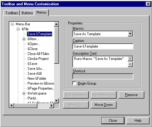 讓我們增加第一個Save As 模板宏到文件菜單中。你可以點擊文件菜單條並選擇定制。接著選擇菜單標簽並導航到你想增加新的宏的地方去。點擊Add Submenu(增加子菜單)按鈕並填充缺少的項。對話框如圖1所示。