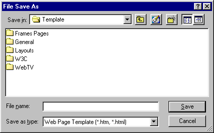 在本節教程的例子中,我們創建了一個新的保存模塊文件對話框。HoTMetaL裡面有幾個模板你可以從中進行選擇。模板只是一個普通的網頁,這個網頁被保存HoTMetaL應用程序目錄的Template模板中。當你從文件菜單中選擇新項目的時候,其中一個標簽選項是Page From Template。當你選擇了它,就會彈出一個標簽對話框,上面包含了各種模板: General、 WebTV、 W3C、 Frame Pages、 Layout。