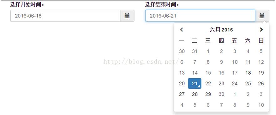 <div class="row"> <div class='col-sm-6'> <div class="form-group"> <label>選擇開始時間:</label> <!--指定 date標記--> <div class='input-group date' id='datetimepicker1'> <input type='text' class="form-control" /> <span class="input-group-addon"> <span class="glyphicon glyphicon-calendar"></span> </span> </div> </div> </div> <div class='col-sm-6'> <div class="form-group"> <label>選擇結束時間:</label> <!--指定 date標記--> <div class='input-group date' id='datetimepicker2'> <input type='text' class="form-control" /> <span class="input-group-addon"> <span class="glyphicon glyphicon-calendar"></span> </span> </div> </div> </div> </div>