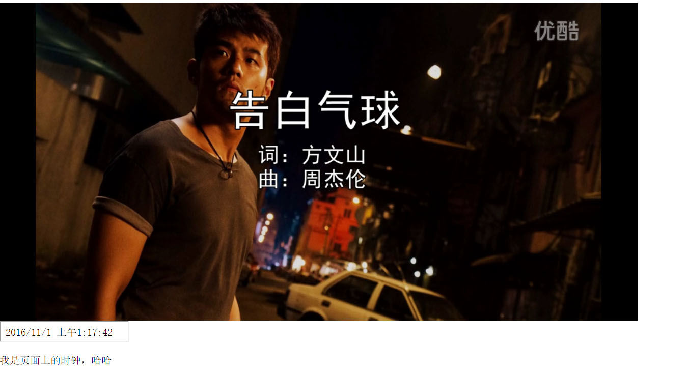 即我們在div中只創建一個p,把時鐘放到p中去,動態的刷新p,並且這是你可以添加文字或者圖片,發現都不會有影響。這就大功告成了嗎?如果你嘗試這在div中插入一個視頻,就會發現,視頻會在你規定的時間不斷刷新,播放不了,因此圖片和文字看不出來,是因為我們肉眼沒法分辨,因此,這種方法也不可取。
