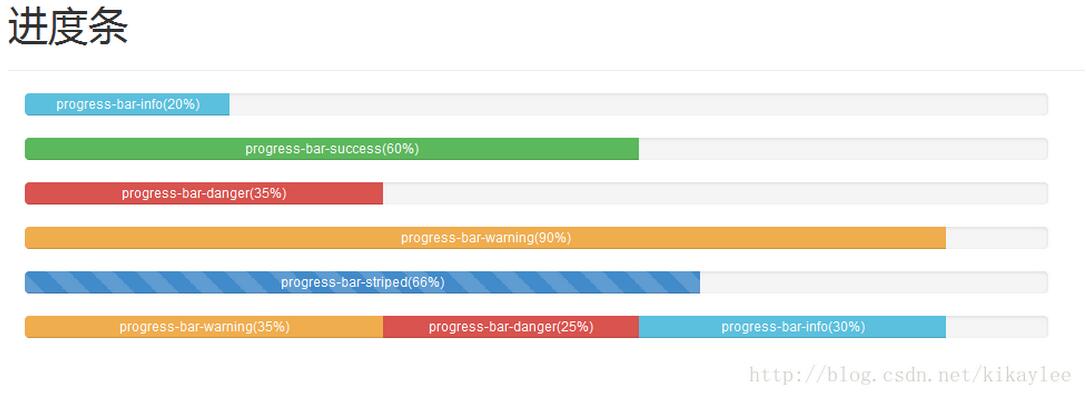 <div class="progress"> <div class="progress-bar progress-bar-warning" style="width: 35%">progress-bar-warning(35%)</div> <div class="progress-bar progress-bar-danger" style="width: 25%">progress-bar-danger(25%)</div> <div class="progress-bar progress-bar-info" style="width: 30%">progress-bar-info(30%)</div> </div>