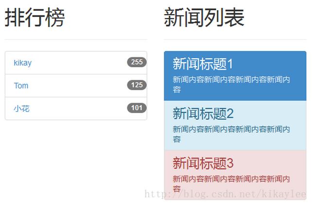 <!DOCTYPE html> <html lang="zh-cn"> <head> <meta charset="UTF-8"> <meta name="viewport" content="width=device-width, initial-scale=1"> <link href="../../css/bootstrap.min.css" rel="stylesheet"> <script src="http://cdn.bootcss.com/jquery/1.11.1/jquery.min.js"></script> <script src="../../js/bootstrap.min.js"></script> <title>列表組</title> </head> <body> <div class="container"> <div class="col-lg-3"> <div class="page-header"> <h1>排行榜</h1> </div> <ul class="list-group"> <li class="list-group-item"> <a href="#"> kikay <span class="badge navbar-right">255</span> </a> </li> <li class="list-group-item"> <a href="#"> Tom <span class="badge navbar-right">125</span> </a> </li> <li class="list-group-item"> <a href="#"> 小花 <span class="badge navbar-right">101</span> </a> </li> </ul> </div> <div class="col-lg-3"> <div class="page-header"> <h1>新聞列表</h1> </div> <div class="list-group"> <div class="list-group-item active"> <h3 class="list-group-item-heading">新聞標題1</h3> <p class="list-group-item-text">新聞內容新聞內容新聞內容新聞內容</p> </div> <div class="list-group-item list-group-item-info"> <h3 class="list-group-item-heading">新聞標題2</h3> <p class="list-group-item-text">新聞內容新聞內容新聞內容新聞內容</p> </div> <div class="list-group-item list-group-item-danger"> <h3 class="list-group-item-heading">新聞標題3</h3> <p class="list-group-item-text">新聞內容新聞內容新聞內容新聞內容</p> </div> </div> </div> </div> </body> </html>