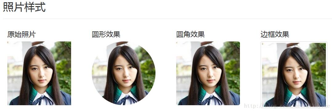<!DOCTYPE html> <html lang="zh-cn"> <head> <meta charset="UTF-8"> <meta name="viewport" content="width=device-width, initial-scale=1"> <link href="../../css/bootstrap.min.css" rel="stylesheet"> <script src="http://cdn.bootcss.com/jquery/1.11.1/jquery.min.js"></script> <script src="../../js/bootstrap.min.js"></script> <title>圖片</title> </head> <body> <div class="container"> <div class="page-header"> <h1>照片樣式</h1> </div> <div class="col-lg-3"> <h3>原始照片</h3> <img src="../../img/girl.jpg"> </div> <div class="col-lg-3"> <h3>圓形效果</h3> <img src="../../img/girl.jpg" class="img-circle"> </div> <div class="col-lg-3"> <h3>圓角效果</h3> <img src="../../img/girl.jpg" class="img-rounded"> </div> <div class="col-lg-3"> <h3>邊框效果</h3> <img src="../../img/girl.jpg" class="img-thumbnail"> </div> </div> </body> </html>