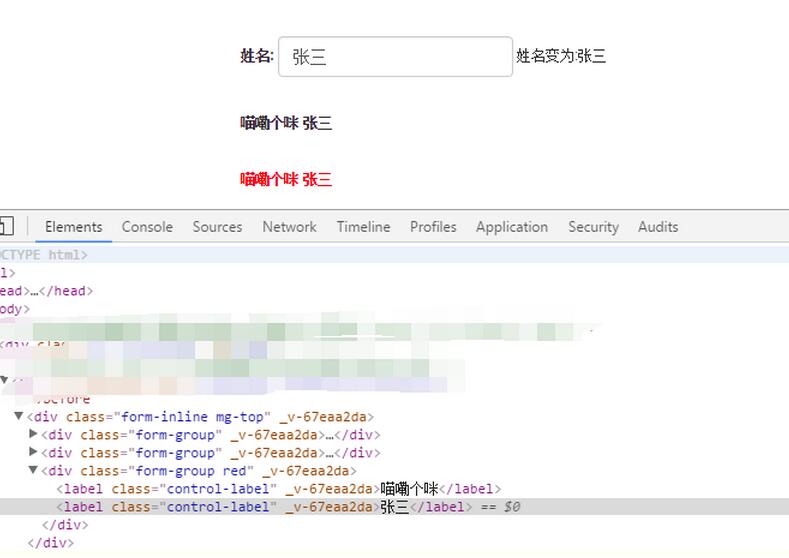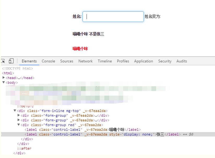 <label class="control-label" v-if='labelShowFlag'>喵嘞個咪</label> <label class="control-label" v-if="testData.name=='張三'" >張三</label> <label class="control-label" v-else>不是張三</label>