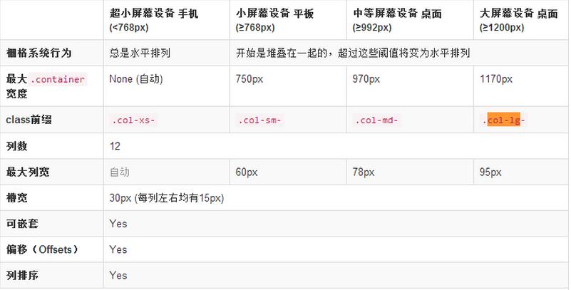 bootstrap3.x使用了四種柵格選項來形成柵格系統,這四種選項在官網上的介紹如下圖,很多人不理解,這裡跟大家詳解一下四種柵格選項之間的區別,其實區別只有一條就是適合不同尺寸的屏幕設備。我們看class前綴這一項,我們姑且以前綴命名這四種柵格選項,他們分別是col-xs、col-sm、col-md、col-lg,我們懂英文的就知道,lg是large的縮寫,md是mid的縮寫,sm是small的縮寫,xs是***的縮寫。這樣命名就體現了這幾種class適應的屏幕寬度不同。下面我們分別介紹這幾種class的特點。