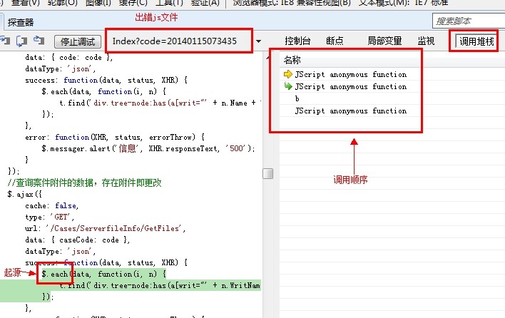 在IE中調試JS猶如在VS中調試.net一樣,有調用堆棧,只要點幾下,就能夠發現,是在哪個地方調用的這行代碼出現的錯誤: