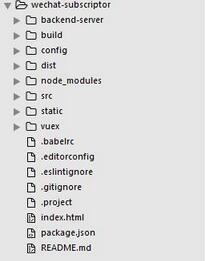 npm install vue-cli -g 安裝最新版的 vue-cli ,然後 vue init webpack wechat-subscriptor ,按提示經過一步步設置並安裝完依賴包以後,進入項目的目錄並稍作改動,最終目錄結構如下:
