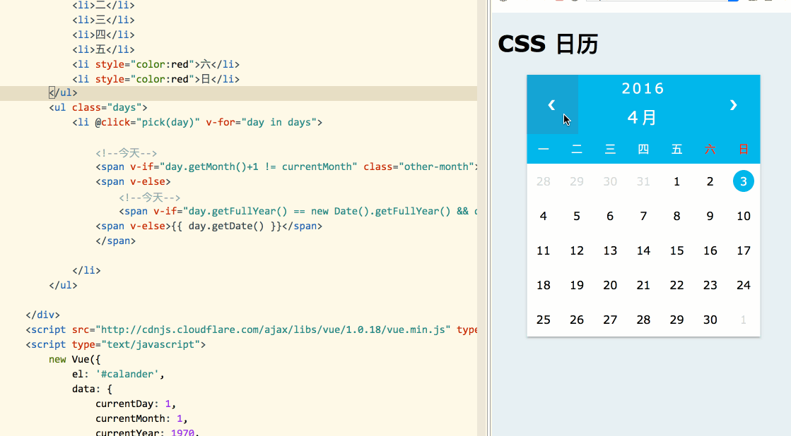 id 為 calendar 對應的創建一個 Vue 對象,設置 el 為 ‘#calendar'。