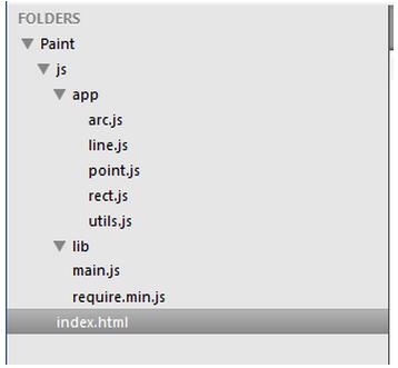 其中index.html是項目的主頁,js目錄下存放所有js文件,js/app目錄為我們自定義的模塊文件,js/lib目錄中暫時沒有文件,當我們的項目裡用到一些其他前端框架如jquery等時,js/lib目錄就存放這些框架的js文件,js/main.js為requirejs的配置文件,主要是配置一些路徑,js/require.min.js是RequireJS框架的文件。下面請跟我一步一步完成這個簡易的繪圖程序吧!