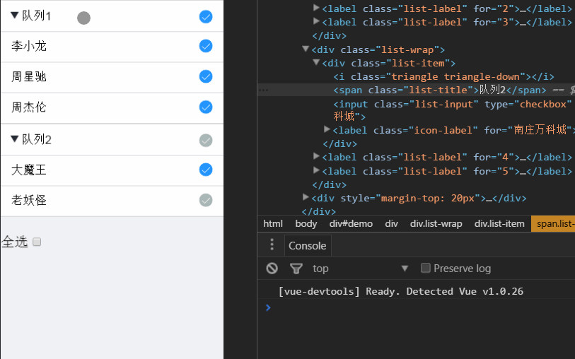 子列表通過v-model=”data.selected”去雙向綁定到selected數組中,當子列表項的checked發生變化時,就會把當前項的id記錄到selected數組裡去