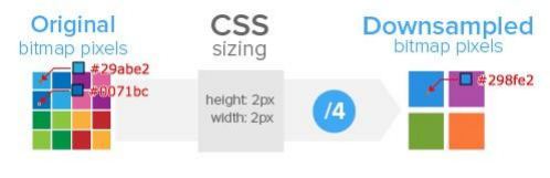 所以它的取色也只能通過一定的算法(顯示結果就是一張只有原圖像素總數四分之一,我們稱這個過程叫做 downsampling),肉眼看上去雖然圖片不會模糊,但是會覺得圖片缺少一些銳利度,或者是有點色差(但還是可以接受的)。