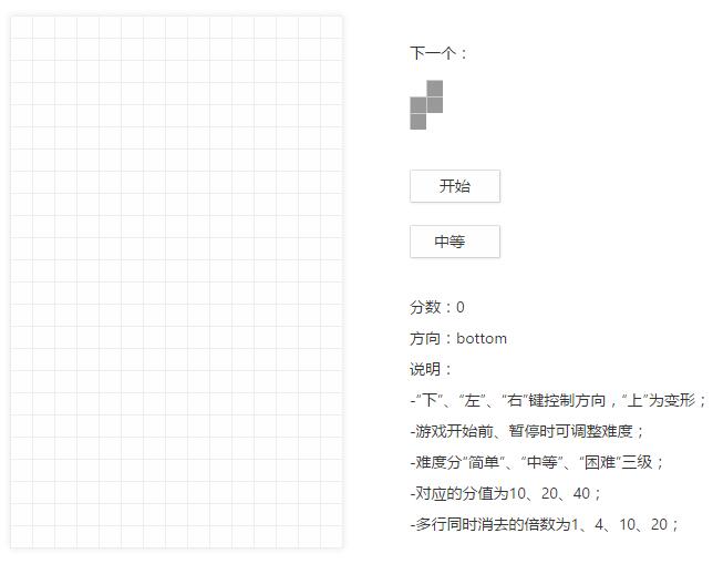 <body> <div class="wrap"> <div class="play_wrap"> <div id="play_area"></div> <div class="play_menu"> <p>下一個:</p> <div id="play_nextType"></div> <a id="play_btn_start" class="play_btn" href="javascript:void(0);" unselectable="on">開始</a><a id="play_btn_level" class="play_btn" href="javascript:void(0)" unselectable="on"><span class="level_text">中等</span class="level_icon"></span></a> <div class="level_menu" id="play_menu_level"> <ul> <li><a href="javascript:void(0)" level=0>簡單</a></li> <li><a href="javascript:void(0)" level=1>中等</a></li> <li><a href="javascript:void(0)" level=2>困難</a></li> </ul> </div> <p> 分數:<span id="play_score">0</span> </p> <p> 方向:<span id="play_direction">bottom</span> </p> <p> 說明:<br> -“下”、“左”、“右”鍵控制方向,“上”為變形;<br> -游戲開始前、暫停時可調整難度;<br> -難度分“簡單”、“中等”、“困難”三級;<br> -對應的分值為10、20、40;<br> -多行同時消去的倍數為1、4、10、20; </p> </div> </div> </div> </body>