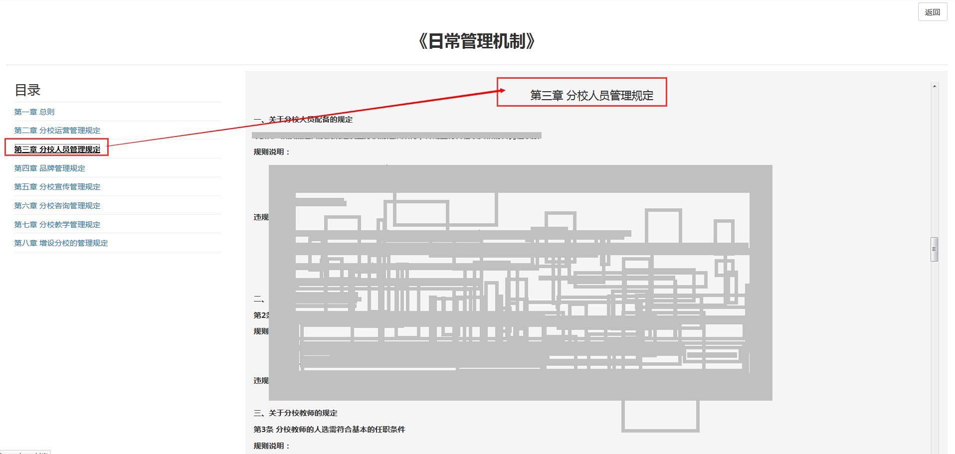 <body style=" position:fixed;" ondragstart="return false" onselectstart="return false" onkeypress="return false" oncontextmenu="return false"> <div class="container-fluid"> <div class="text-right return"> <a class="btn btn-default" href="javascript:history.back()">返回</a> </div> <h2 class="title">《日常管理機制》</h2> <div class="row"> <div class="col-sm-3 hidden-xs left" style="height: 1193px;"> <div class="container-fluid"> <h3>目錄</h3> <div class="sideGuide"> <ul class="list-unstyled lh2"> <li> <span class="text-muted"> <a href="javascript:void(0)">第一章 總則</a> </span> </li> <li> <span class="text-muted"> <a href="javascript:void(0)">第二章 分校運營管理規定</a> </span> </li> <li> <span class="text-muted"> <a href="javascript:void(0)">第三章 分校人員管理規定</a> </span> </li> <li> <span class="text-muted"> <a href="javascript:void(0)">第四章 品牌管理規定</a> </span> </li> <li> <span class="text-muted"> <a href="javascript:void(0)">第五章 分校宣傳管理規定</a> </span> </li> <li> <span class="text-muted"> <a href="javascript:void(0)">第六章 分校咨詢管理規定</a> </span> </li> <li> <span class="text-muted"> <a href="javascript:void(0)">第七章 分校教學管理規定</a> </span> </li> <li> <span class="text-muted"> <a href="javascript:void(0)">第八章 增設分校的管理規定</a> </span> </li> <li></li> </ul> </div> </div> </div> <div class="col-sm-9"> <div class="container-fluid" style="background-color:#f5f5f5"> <div class="tree mb40"> <div id="box0" class="con"> <div id="box1" class="con"> <div id="box2" class="con"> <div id="box3" class="con"> <div id="box4" class="con"> <div id="box5" class="con"> <div id="box6" class="con"> <div id="box7" class="con"> </div> <input id="first" type="hidden" value="8"> </div> </div> </div> </div> </body>