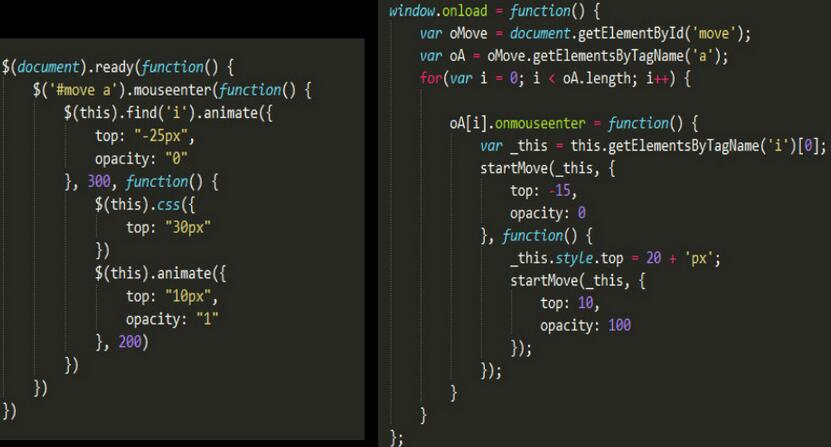 4、在jquery中是mouseenter後接函數,然戶在函數中獲取i然後對i進行相應操作(我們所看到的代碼中好像不涉及操作是否對應了具體的i),而在原生js中是先獲取到‘i',然後進行onmouseenter事件,其對應的是一個函數,且在當前函數中要進一步獲取到具體的i;