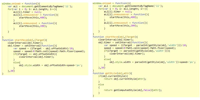 我們可以發現,parseInt(getStyle(obj,'width'))出現了多次,我們可以將將parseInt(getStyle(obj,'width'))賦值給變量icur,這時我們得到的效果就比較好了,此時的代碼如下: