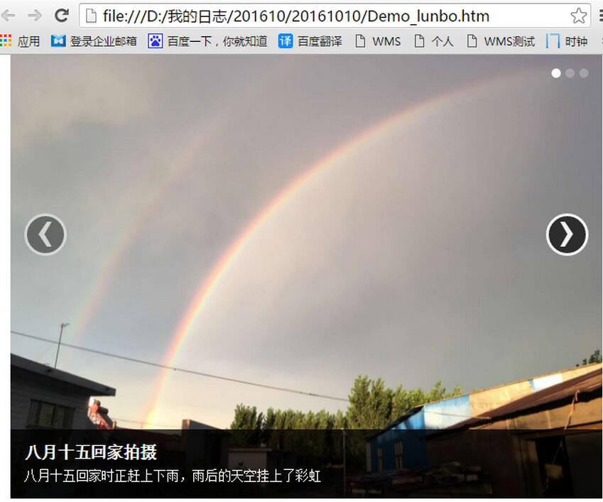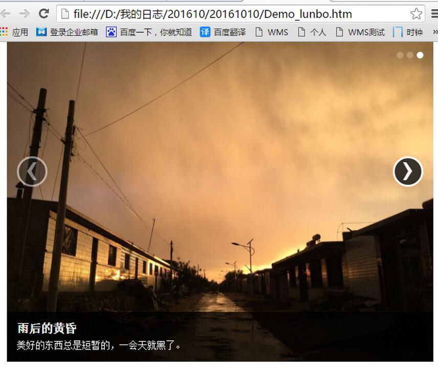 <!DOCTYPE html> <html lang="en"> <head> <meta charset="utf-8"> <title>Bootstrap, from Twitter</title> <meta name="viewport" content="width=device-width, initial-scale=1.0"> <meta name="description" content=""> <meta name="author" content=""> <link href="bootstrap/css/bootstrap.css" rel="stylesheet"> <link href="bootstrap/css/bootstrap-responsive.css" rel="stylesheet"> </head> <body> <div id="myCarousel" class="carousel slide"> <ol class="carousel-indicators"> <li data-target="#myCarousel" data-slide-to="0" class="active"></li> <li data-target="#myCarousel" data-slide-to="1"></li> <li data-target="#myCarousel" data-slide-to="2"></li> </ol> <!-- Carousel items --> <div class="carousel-inner"> <div class="item active"> <img src="Demo_lunbo1.jpg" alt=""> <div class="carousel-caption"> <h4>八月十五回家拍攝</h4> <p>八月十五回家時正趕上下雨,雨後的天空掛上了彩虹</p> </div> </div> <div class="item"> <img src="Demo_lunbo2.jpg" alt=""> <div class="carousel-caption"> <h4>眼睛裡的景色更迷人</h4> <p>照片中的彩虹總不如眼睛看到的美。</p> </div> </div> <div class="item"> <img src="Demo_lunbo3.jpg" alt=""> <div class="carousel-caption"> <h4>雨後的黃昏</h4> <p>美好的東西總是短暫的,一會天就黑了。</p> </div> </div> </div> <!-- Carousel nav --> <a class="carousel-control left" href="#myCarousel" data-slide="prev">‹</a> <a class="carousel-control right" href="#myCarousel" data-slide="next">›</a> </div> <script src="bootstrap/js/jquery.js"></script> <script src="bootstrap/js/bootstrap.js"></script> </body> </html>