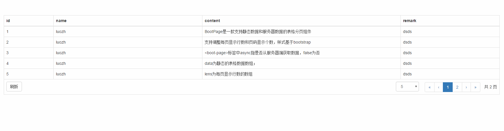 {num: 1, author: 'luozh', contents: 'BootPage是一款支持靜態數據和服務器數據的表格分頁組件', remark: 'dsds'},