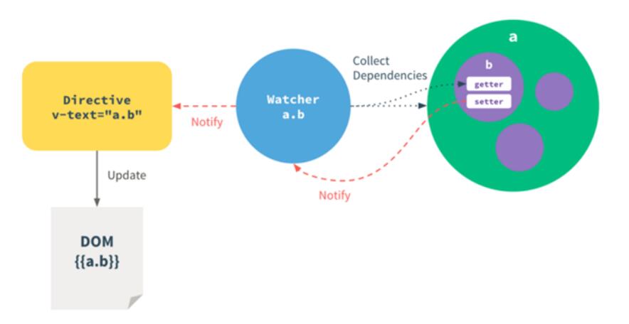模板中每個指令/數據綁定都有一個對應的watcher對象,在計算過程中它把屬性記錄為依賴。之後當依賴的setter被調用時 ,會觸發watcher重新計算。流程如下所示: