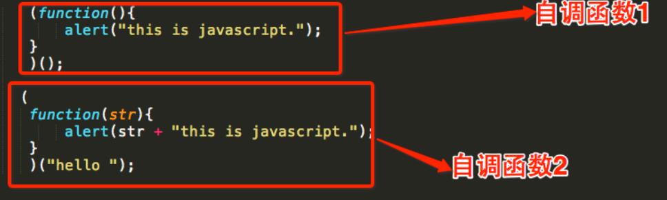 圖中寫的方式就是自調函數的使用,這個函數被兩個小括號包圍著,第一個小括號的作用是封裝,把我們編寫的匿名函數封裝在其中,第二個小括號就是調用了,我們還可以給他初始化,就像第二個自調函數的寫法一樣。