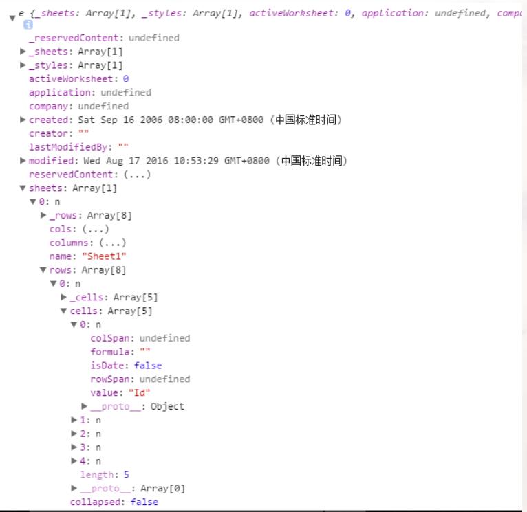 打印這個對象發現,workbook裡面包含sheets數組,每個sheet包含rows數組,每個row包含cells數組,每個cell裡面vaule屬性就是單元格的值。