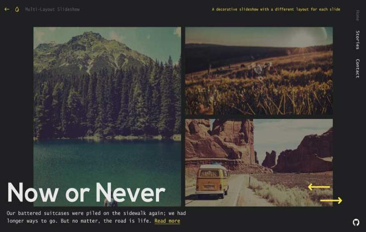 這是一款效果非常炫酷的不同風格頁面布局幻燈片特效。該特效中,通過前後導航按鈕來切換幻燈片,每個幻燈片中的圖片均為不同的布局效果。