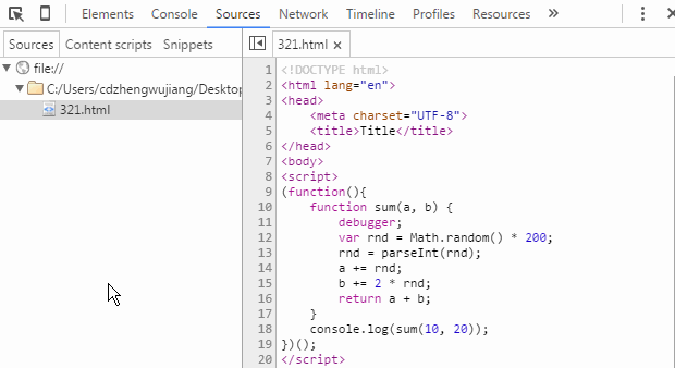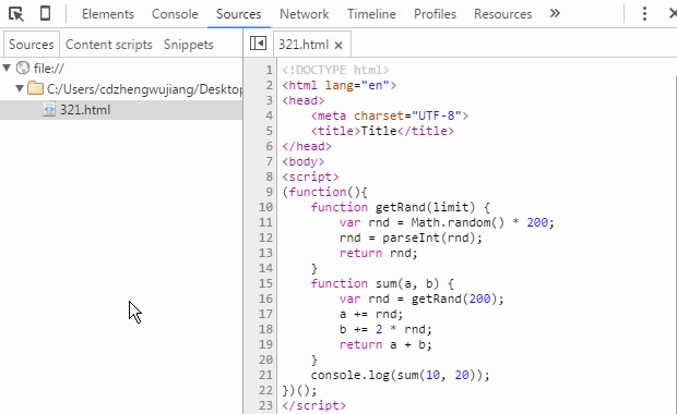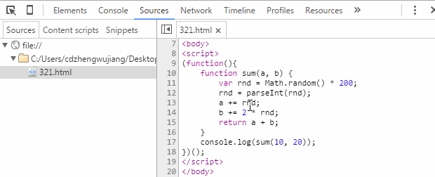 代碼很簡單,就是定義一個函數,傳入兩個數,分別加上一個亂七八糟的隨機整數後,再返回兩個數的總和。以Chrome開發者工具為例,我們來看一下JS斷點調試的基本方法。