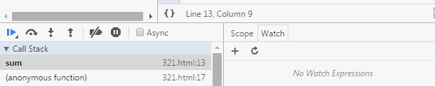 那問題來了,仔細的朋友會發現當我的代碼執行到斷點的時候,顯示的變量a和b的值是已經進行過加法運算後的,我們看不到調用sum函數時初始傳入的10和20。那麼該怎麼辦呢?這就要回過頭來先學習一下斷點調試的一些基礎知識了。我們打開Sources面板後其實會在界面中看到如下內容,我們跟著鼠標軌跡逐一看看都是什麼意思:
