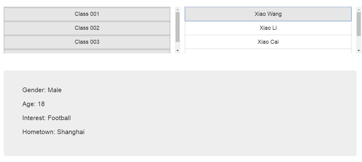 為三大塊:第一行左邊為班級列表,第一行右邊為同學姓名列表,第二行為同學相關信息。