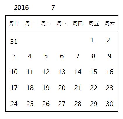 //實現二:根據當月第一天的星期x,設置第一天的margin-left=寬度*x,使其對應到正確的星期位置上