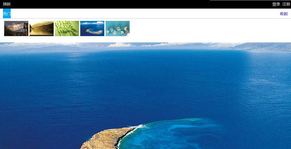 <body> <div id="header"> <div id="header_con"> <div class="dbg"><a href="javascript:;" onclick="showImgBox()">換膚</a></div> </div> </div> <div id="dimgBox"> <div id="dimgtitle"> <div id="imgtitle_con"> <div id="title1"><a href="javascript:;">熱門</a></div> <div id="title2"><a href="javascript:;" onclick="hideImgBox()">收起</a></div> </div> </div> <div id="imglist"> <div class="imgitem"><img src="image/bg0.jpg" /></div> <div class="imgitem"><img src="image/bg1.jpg" /></div> <div class="imgitem"><img src="image/bg2.jpg" /></div> <div class="imgitem"><img src="image/bg3.jpg" /></div> <div class="imgitem"><img src="image/bg4.jpg" /></div> </div> </div> </body>