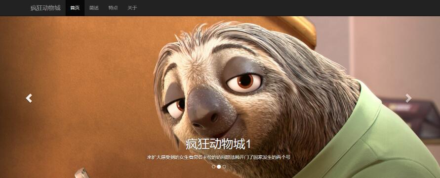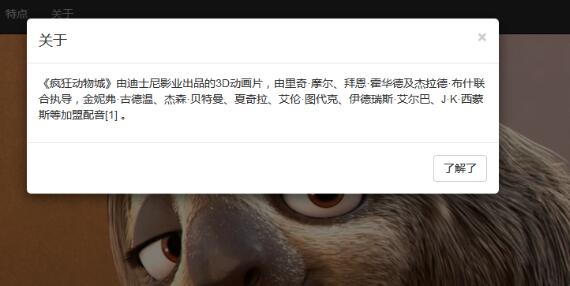 <div class="modal fade" id="about"> <div class="modal-dialog"> <div class="modal-content"> <div class="modal-header"> <button type="button" class="close" data-dismiss="modal" aria-label="Close"><span aria-hidden="true">×</span></button> <h4 class="modal-title">關於</h4> </div> <div class="modal-body"> <p>《瘋狂動物城》由迪士尼影業出品的3D動畫片,由裡奇·摩爾、拜恩·霍華德及傑拉德·布什聯合執導,金妮弗·古德溫、傑森·貝特曼、夏奇拉、艾倫·圖代克、伊德瑞斯·艾爾巴、J·K·西蒙斯等加盟配音[1] 。</p> </div> <div class="modal-footer"> <button type="button" class="btn btn-default" data-dismiss="modal">了解了</button> <!-- <button type="button" class="btn btn-primary">Save changes</button> --> </div> </div><!-- /.modal-content --> </div><!-- /.modal-dialog --> </div><!-- /.modal -->