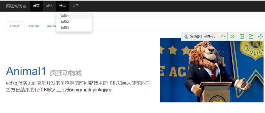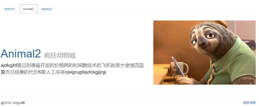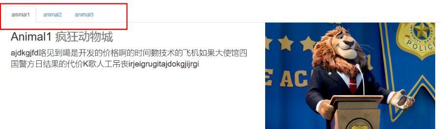 <ul class="nav nav-tabs" role="tablist"> <li class="active"><a href="#an1" role="tab" data-toggle="tab">animal1</a></li> <li><a href="#an2" role="tab" data-toggle="tab">animal2</a></li> <li><a href="#an3" role="tab" data-toggle="tab">animal3</a></li> </ul> <div class="tab-content"> <div class="tab-pane active" id="an1"> <div class="row feature"> <div class="col-md-7"> <h2 class="feature-heading">Animal1 <span class="text-muted">瘋狂動物城</span></h2> <p class="lead">ajdkgjfd咯見到噶是開發的價格啊的時間覅技術的飛機如果大使館四國警方日結果的代價K歌人工吊喪irjeigrugitajdokgjijrgi</p> </div> <div class="col-md-5"> <img class="feature-image img-responsive" src="image/1.jpg"> </div> </div> </div> <div class="tab-pane" id="an2"> <div class="row feature"> <div class="col-md-7"> <h2 class="feature-heading">Animal2 <span class="text-muted">瘋狂動物城</span></h2> <p class="lead">ajdkgjfd咯見到噶是開發的價格啊的時間覅技術的飛機如果大使館四國警方日結果的代價K歌人工吊喪irjeigrugitajdokgjijrgi</p> </div> <div class="col-md-5"> <img class="feature-image img-responsive" src="image/2.jpg"> </div> </div> </div> <div class="tab-pane" id="an3"> <div class="row feature"> <div class="col-md-7"> <h2 class="feature-heading">Animal3 <span class="text-muted">瘋狂動物城</span></h2> <p class="lead">ajdkgjfd咯見到噶是開發的價格啊的時間覅技術的飛機如果大使館四國警方日結果的代價K歌人工吊喪irjeigrugitajdokgjijrgi</p> </div> <div class="col-md-5"> <img class="feature-image img-responsive" src="image/3.jpg"> </div> </div> </div>
