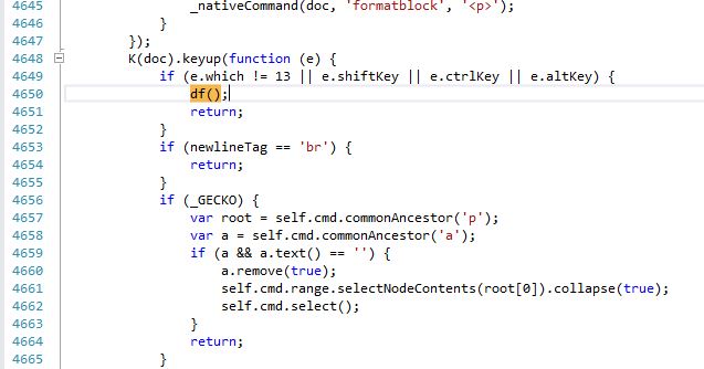 找到kindeditor.js文件,在keyup()事件中添加自定義代碼。不同版本的Kindeditor所提供的代碼差別可能會比較大,需要借助於官方文檔進行查找。本文基於Kindeditor 4.1.10版本。