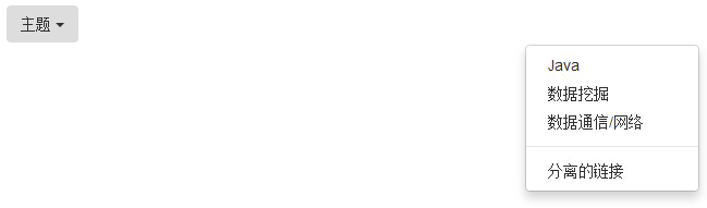 <!DOCTYPE html> <html> <head> <title>Bootstrap 實例 - 下拉菜單(Dropdowns)</title> <link href="/bootstrap/css/bootstrap.min.css" rel="stylesheet"> <script src="/scripts/jquery.min.js"></script> <script src="/bootstrap/js/bootstrap.min.js"></script> </head> <body> <div class="dropdown"> <button type="button" class="btn dropdown-toggle" id="dropdownMenu1" data-toggle="dropdown"> 主題 <span class="caret"></span> </button> <ul class="dropdown-menu" role="menu" aria-labelledby="dropdownMenu1"> <li role="presentation"> <a role="menuitem" tabindex="-1" href="#">Java</a> </li> <li role="presentation"> <a role="menuitem" tabindex="-1" href="#">數據挖掘</a> </li> <li role="presentation"> <a role="menuitem" tabindex="-1" href="#"> 數據通信/網絡 </a> </li> <li role="presentation" class="divider"></li> <li role="presentation"> <a role="menuitem" tabindex="-1" href="#">分離的鏈接</a> </li> </ul> </div> </body> </html>