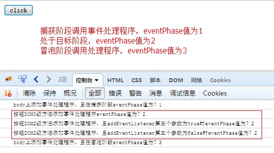 console.log("按鈕DOM2級方法添加事件處理程序,且addEventListener第三個參數為true時eventPhase值為?"+event.eventPhase);