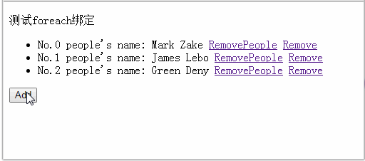 這裡比較容易搞混的是DOM節點與ViewModel的層次對應關系。首先,在ul上應用 foreach 綁定,也就是每個 li 對應每個 people 子項。這一點對應上了之後,就按照 js 的作用域規則去理解即可。說到作用域,不得不提 this,正所謂我待this如初戀,this坑我千百遍。這裡小茄在官方版本上加了個remove函數,與官方的removePeople對應起來看就簡單了。至於$index, $parent這些變量,按字面意思理解即可。