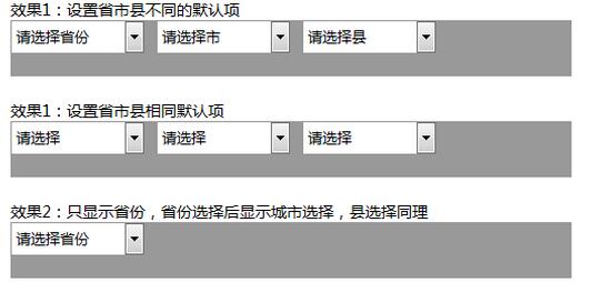 <p>效果2:只顯示省份,省份選擇後顯示城市選擇,縣選擇同理</p>