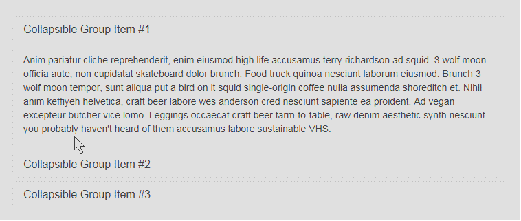 <div class="container" style="margin-top:140px;"> <div class="panel-group" id="accordion"> <div class="panel panel-default"> <div class="panel-heading"> <h4 class="panel-title"> <a data-toggle="collapse" data-toggle="collapse" data-parent="#accordion" href="#collapseOne"> Collapsible Group Item </a> </h4> </div> <div id="collapseOne" class="panel-collapse collapse in"> <div class="panel-body"> Anim pariatur cliche reprehenderit, enim eiusmod high life accusamus terry richardson ad squid. 3 wolf moon officia aute, non cupidatat skateboard dolor brunch. Food truck quinoa nesciunt laborum eiusmod. Brunch 3 wolf moon tempor, sunt aliqua put a bird on it squid single-origin coffee nulla assumenda shoreditch et. Nihil anim keffiyeh helvetica, craft beer labore wes anderson cred nesciunt sapiente ea proident. Ad vegan excepteur butcher vice lomo. Leggings occaecat craft beer farm-to-table, raw denim aesthetic synth nesciunt you probably haven't heard of them accusamus labore sustainable VHS.</div> </div> </div> <div class="panel panel-default"> <div class="panel-heading"> <h4 class="panel-title"> <a data-toggle="collapse" data-toggle="collapse" data-parent="#accordion" href="#collapseTwo"> Collapsible Group Item #2 </a> </h4> </div> <div id="collapseTwo" class="panel-collapse collapse"> <div class="panel-body"> Anim pariatur cliche reprehenderit, enim eiusmod high life accusamus terry richardson ad squid. 3 wolf moon officia aute, non cupidatat skateboard dolor brunch. Food truck quinoa nesciunt laborum eiusmod. Brunch 3 wolf moon tempor, sunt aliqua put a bird on it squid single-origin coffee nulla assumenda shoreditch et. Nihil anim keffiyeh helvetica, craft beer labore wes anderson cred nesciunt sapiente ea proident. Ad vegan excepteur butcher vice lomo. Leggings occaecat craft beer farm-to-table, raw denim aesthetic synth nesciunt you probably haven't heard of them accusamus labore sustainable VHS. </div> </div> </div> <div class="panel panel-default"> <div class="panel-heading"> <h4 class="panel-title"> <a data-toggle="collapse" data-toggle="collapse" data-parent="#accordion" href="#collapseThree"> Collapsible Group Item #3 </a> </h4> </div> <div id="collapseThree" class="panel-collapse collapse"> <div class="panel-body"> Anim pariatur cliche reprehenderit, enim eiusmod high life accusamus terry richardson ad squid. 3 wolf moon officia aute, non cupidatat skateboard dolor brunch. Food truck quinoa nesciunt laborum eiusmod. Brunch 3 wolf moon tempor, sunt aliqua put a bird on it squid single-origin coffee nulla assumenda shoreditch et. Nihil anim keffiyeh helvetica, craft beer labore wes anderson cred nesciunt sapiente ea proident. Ad vegan excepteur butcher vice lomo. Leggings occaecat craft beer farm-to-table, raw denim aesthetic synth nesciunt you probably haven't heard of them accusamus labore sustainable VHS. </div> </div> </div> </div> </div>