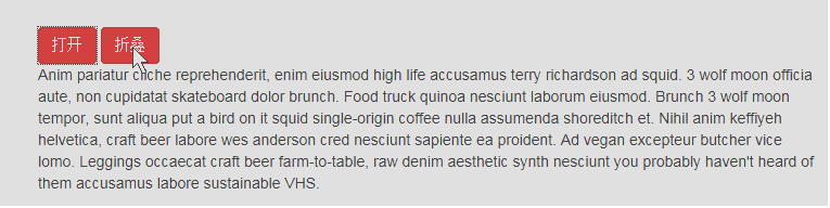 <div class="container" style="margin-top:140px;"> <button type="button" class="btn btn-danger" data-toggle="collapse" data-target="#demo"> simple collapsible </button> <div id="demo" class="collapse in">Anim pariatur cliche reprehenderit, enim eiusmod high life accusamus terry richardson ad squid. 3 wolf moon officia aute, non cupidatat skateboard dolor brunch. Food truck quinoa nesciunt laborum eiusmod. Brunch 3 wolf moon tempor, sunt aliqua put a bird on it squid single-origin coffee nulla assumenda shoreditch et. Nihil anim keffiyeh helvetica, craft beer labore wes anderson cred nesciunt sapiente ea proident. Ad vegan excepteur butcher vice lomo. Leggings occaecat craft beer farm-to-table, raw denim aesthetic synth nesciunt you probably haven't heard of them accusamus labore sustainable VHS.</div>