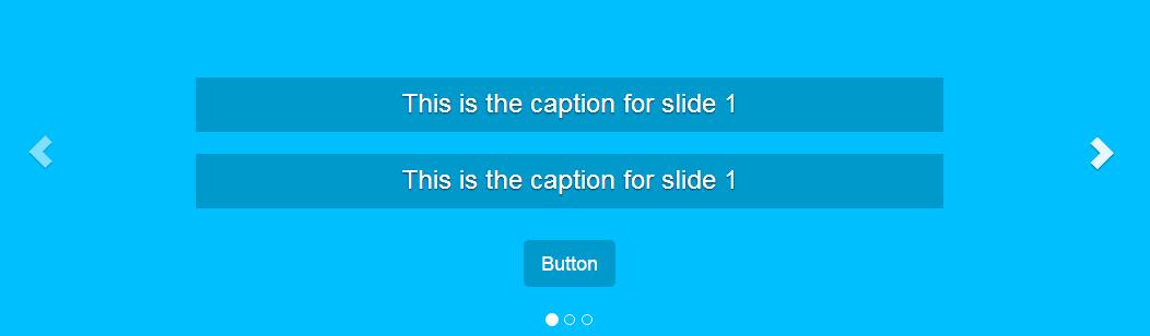 <div id="carousel-example-generic" class="carousel slide" data-ride="carousel"> <!-- Indicators --> <ol class="carousel-indicators"> <li data-target="#carousel-example-generic" data-slide-to="0" class="active"> </li> <li data-target="#carousel-example-generic" data-slide-to="1"></li> <li data-target="#carousel-example-generic" data-slide-to="2"></li> </ol> <!-- Wrapper for slides --> <div class="carousel-inner" role="listbox"> <!-- First slide --> <div class="item active"> <div class="carousel-caption"> <h3 data-animation="animated bounceInLeft"> This is the caption for slide 1 </h3> <h3 data-animation="animated bounceInRight"> This is the caption for slide 1 </h3> <button class="btn btn-primary btn-lg" data-animation="animated zoomInUp">Button</button> </div> </div><!-- /.item --> <!-- Second slide --> <div class="item"> <div class="carousel-caption"> <h3 class="icon-container" data-animation="animated bounceInDown"> <span class="glyphicon glyphicon-heart"></span> </h3> <h3 data-animation="animated bounceInUp"> This is the caption for slide 2 </h3> <button class="btn btn-primary btn-lg" data-animation="animated zoomInRight">Button</button> </div> </div><!-- /.item --> <!-- Third slide --> <div class="item"> <div class="carousel-caption"> <h3 class="icon-container" data-animation="animated zoomInLeft"> <span class="glyphicon glyphicon-glass"></span> </h3> <h3 data-animation="animated flipInX"> This is the caption for slide 3 </h3> <button class="btn btn-primary btn-lg" data-animation="animated lightSpeedIn">Button</button> </div> </div><!-- /.item --> </div><!-- /.carousel-inner --> <!-- Controls --> <a class="left carousel-control" href="#carousel-example-generic" role="button" data-slide="prev"> <span class="glyphicon glyphicon-chevron-left" aria-hidden="true"></span> <span class="sr-only">Previous</span> </a> <a class="right carousel-control" href="#carousel-example-generic" role="button" data-slide="next"> <span class="glyphicon glyphicon-chevron-right" aria-hidden="true"></span> <span class="sr-only">Next</span> </a> </div><!-- /.carousel -->